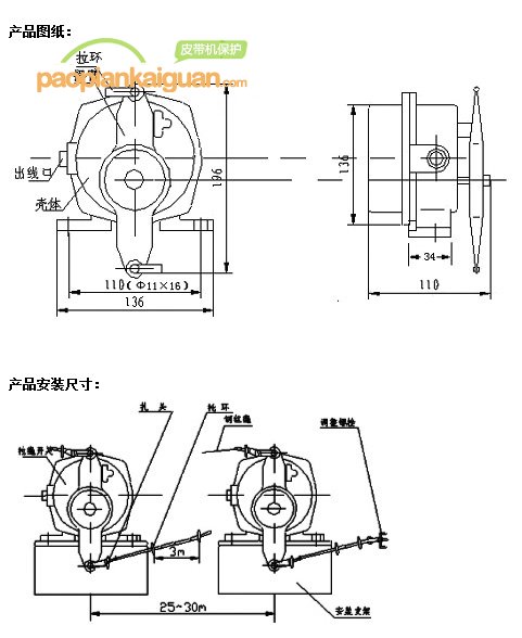 本機(jī)采用稱勸式凸輪結(jié)構(gòu),當(dāng)拉動(dòng)拉繩開(kāi)關(guān)的任意一側(cè)或同時(shí)拉動(dòng)兩側(cè)繩索時(shí),均可驅(qū)動(dòng)凸輪,使開(kāi)關(guān)動(dòng)作轉(zhuǎn)換,發(fā)出停機(jī),報(bào)警信號(hào)。