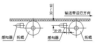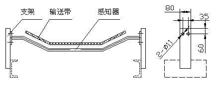 (2) B型感知器為槽型,應(yīng)安裝在帶式輸送機(jī)落料點(diǎn)緩沖托輥之間。見(jiàn)圖5、6。