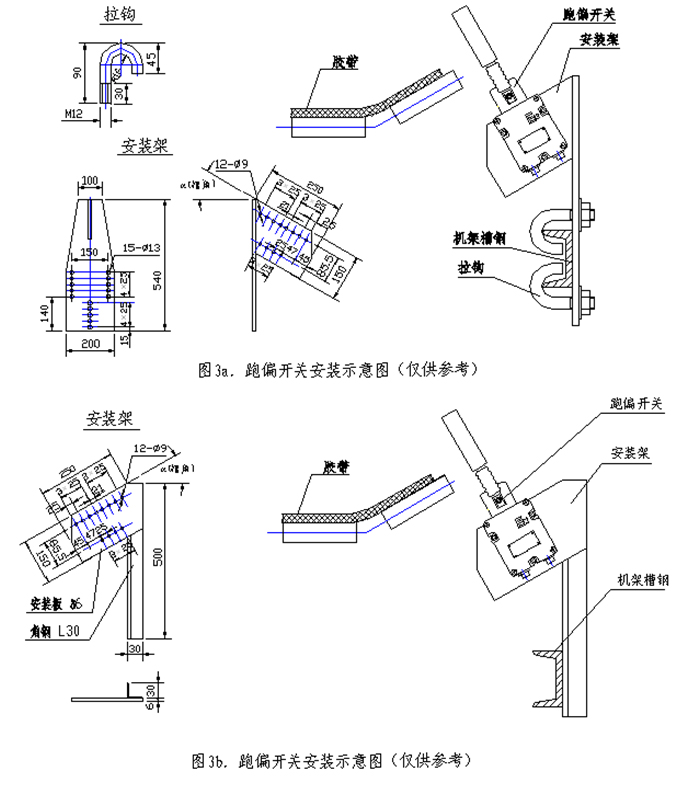 跑偏開關(guān)的安裝可參考圖3所示。圖3a安裝適用于煤礦井下或不宜焊接的場合,圖3b安裝適用于可以焊接的場合。