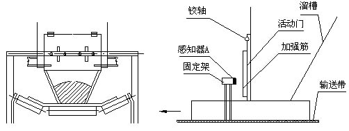 (1) A型感知器可安裝在卸料溜槽出料口處時(shí),見(jiàn)圖4。在出料口上部自制簡(jiǎn)易鉸接活動(dòng)門(mén)(寬700×高400×厚8mm),通過(guò)鉸接固定在溜槽出料口上部。溜槽開(kāi)口尺寸為(寬600×高400mm),活動(dòng)門(mén)高度應(yīng)不影響物料運(yùn)輸。在活動(dòng)門(mén)外20~30mm處安裝A型感知器,A型感知器固定在現(xiàn)場(chǎng)自制的機(jī)架上。當(dāng)溜槽堵塞時(shí),物料擠壓活動(dòng)門(mén),觸動(dòng)感知器發(fā)出停機(jī)信號(hào)。